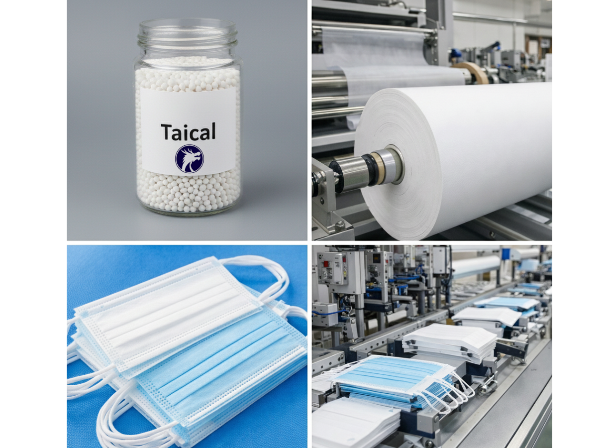 Trong sản xuất khẩu trang y tế không dệt, hạt Taical được sử dụng rộng rãi như một phụ gia chức năng nhằm tối ưu chi phí và cải thiện hiệu suất gia công cho các dòng nhựa nền PP.